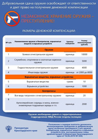 Постановлением главы администрации (губернатора) Краснодарского края от 16.04.2019 № 209 «О выплате денежного вознаграждения гражданам за добровольную сдачу оружия, боеприпасов, взрывчатых веществ и взрывных устройств» утверждено Положение о порядке осуществления выплаты денежного вознаграждения гражданам за добровольную сдачу оружия, боеприпасов, взрывчатых веществ и взрывных устройств.